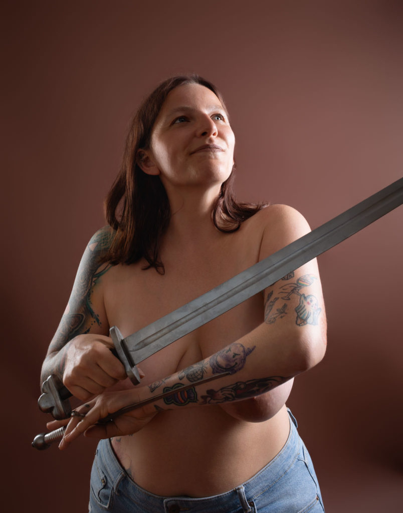 C’est Alexandre, Professeur d’escrime à Samer ( association :https://www.facebook.com/profile.php?id=100085140426256 ) et mari d’une amie modèle, qui m’a soufflé l’idée. Pourquoi ne pas associer photographie et escrime ? Pourquoi ne pas demander à des femmes de poser avec des armes blanches ?
