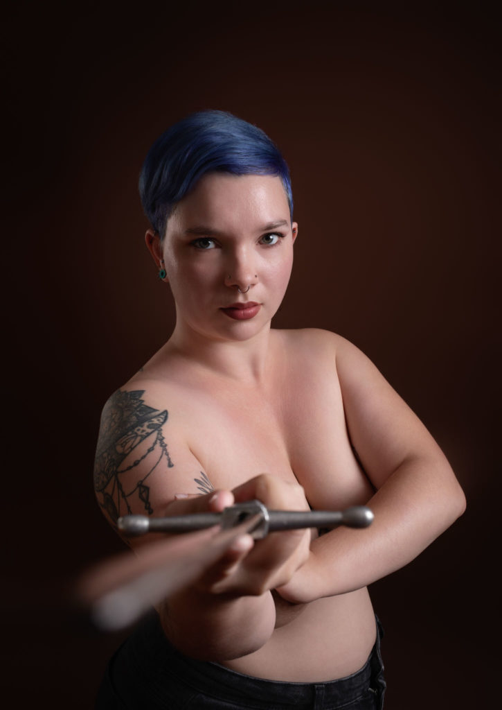Avec trois volontaires, nous avons tenté une première série de tests. Mais mes choix techniques furent malheureux. J’avais opté pour une grande source de lumière frontale : le résultat fut plat, sans relief. J’avais choisi des portraits trop serrés : les armes perdaient leur sens. Et j’avais utilisé un fond rose, croyant coller à l’esprit d’Octobre Rose : le résultat sombrait dans la facilité.